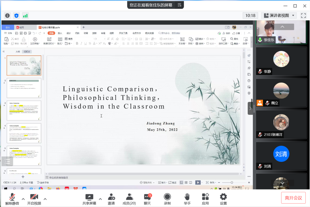 讲座伊始,张佳东老师带来主题为“语言对比,哲学思考,课堂中的智慧教学——从汉英对比语言学的角度看翻译课堂”的经验分享。张佳东老师是南开大学语言学博士,研究方向为戏剧翻译、戏剧符号学、视听翻译和海外汉学。讲座由三部分组成:英汉语言差异;由英汉对比引发的思考;语言教学和翻译技巧。张老师通过生动的教学及生活中的案例,从词汇、句法两方面深入浅出地剖析了英语和汉语的不同之处。他强调,对翻译专业的学生而言,汉语学习与英语学习同等重要。张老师的讲座既有丰富的理论分析,也有详实的案例,体现了他对翻译教学的深入思考、循循善诱的教学风格、严谨的治学态度,以及扎实的英汉双语功底。在互动环节,参会的老师针对教学方式改革以及如何提高学生汉语语言水平等话题展开了热烈的讨论。张佳东老师认为,提高学生的汉语水平,首要任务是发现问题并且找准切入点,建议可以有针对性地推送优秀文章供学生阅读。