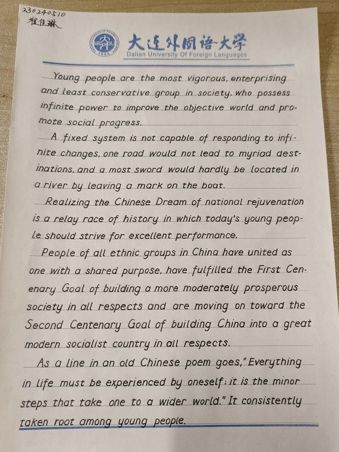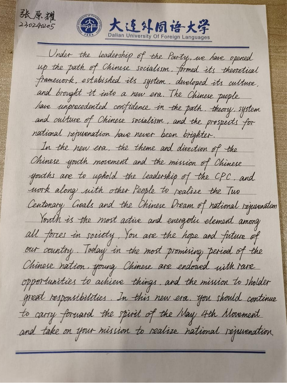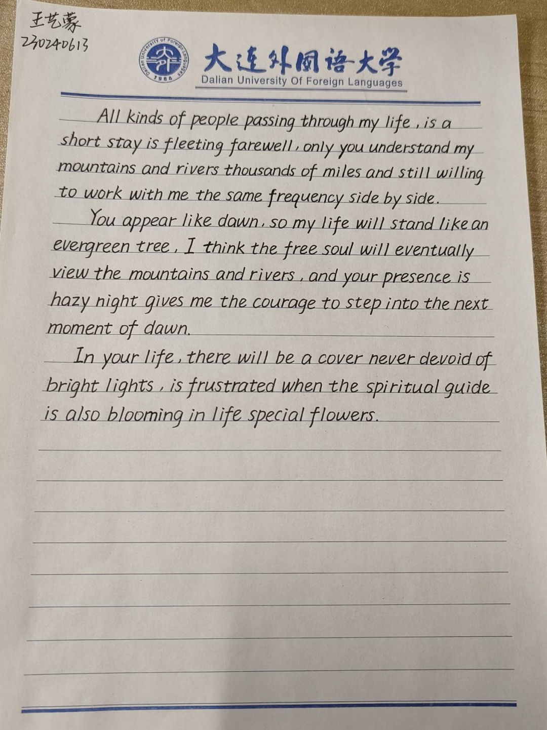 紧跟时代步伐,深入学习贯彻党的二十大精神,致力于促进双语教育的发展,培养学生审美能力和艺术修养,学院举办了第四届双语书法大赛。本次大赛不仅结合了中西方文化,传承中华优秀传统文化,还为学生提供了一个展现自己的机会,促进跨文化交流与理解,推动精神文明建设。
