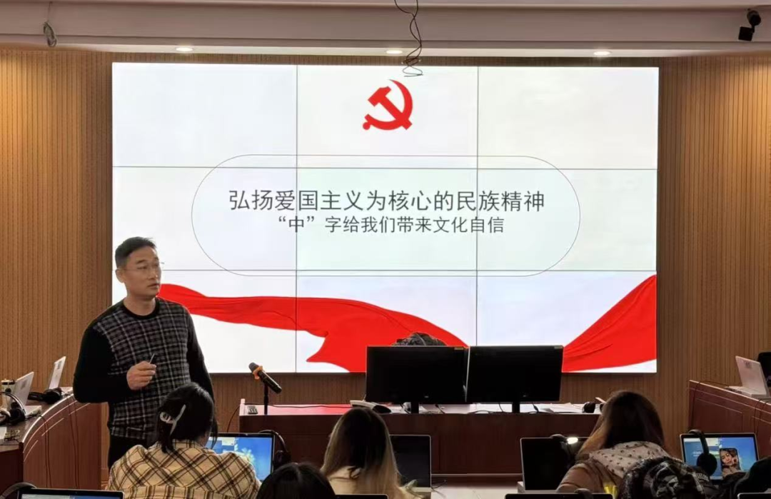 组织员易宏波主讲,主题是“弘扬爱国主义为核心的民族精神——‘中’字给我们带来文化自信”。